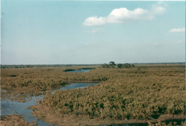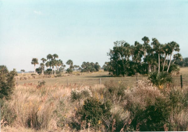 We are at Flager Beach, Florida in a beautiful KOA campground. From here we will leave the trailer and take the truck-camper to drive over to Kissimmee on Highway 528 to the Kennedy Space Center. The photo shows the open marsh area of the route, and the marches, pines, and palms.