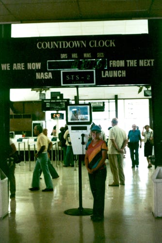 We arrived at the Kennedy Space Center on November 11th and toured the complex. Inside Nancy is standing in front of the countdown clock of “Columbia" - STS 2 at 18 hours, 20 minutes, and 06 seconds before the launch.