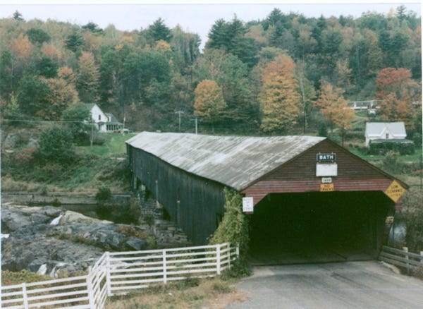 This is on the Ammonoosuc River and is 390 feet long and 22 feet wide, and was constructed in 1832. The bridge has four spans supported by Burr trusses. Driving along the two-lane road and the town of Bath.