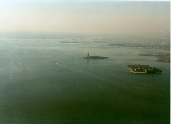 On the boat, we are approaching the Statue of Liberty, with a height from the foundation to the top of the torch at 305 feet, it weighs over 200 tons and has a total of 354 steps to the viewing platform in the crown. Well, we did it, we climbed the steep steps that are only 19 inches wide, with a head clearance of 6 feet 2 inches. This climb is strenuous and is equivalent to 20 stories.