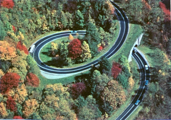 The Great Smoky National Park is located half in Tennessee and North Carolina. This is the most massive uplift in Eastern America and attracts over 5 million visitors a year. More than any other in the National Park System. A postcard of the scenic U.S. 441 road that climbs rapidly from Gatlinburg to the 5,048-foot Newfound Gap, where it makes this exciting loop.