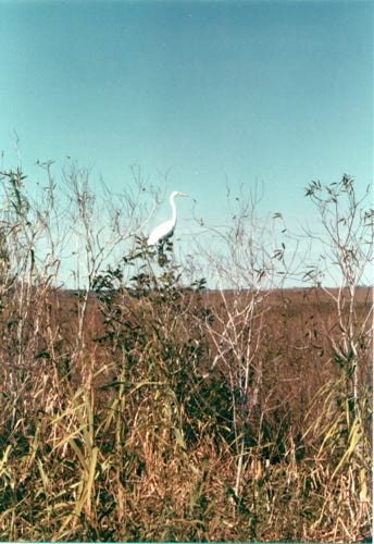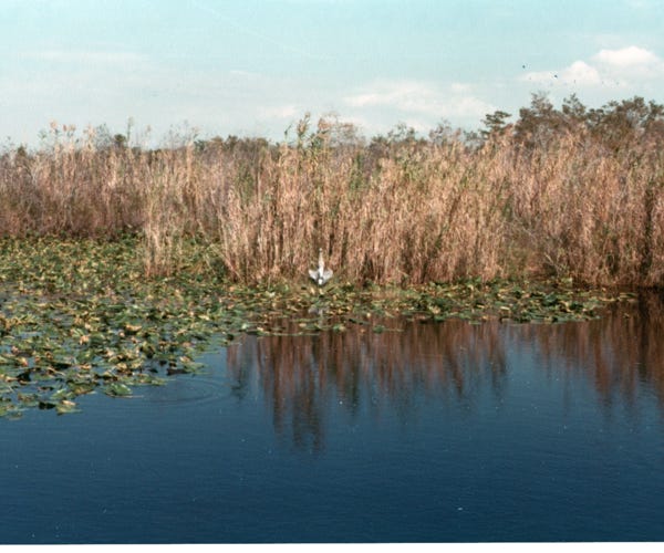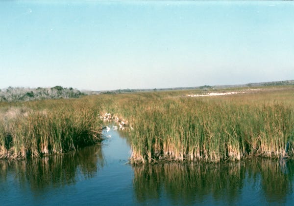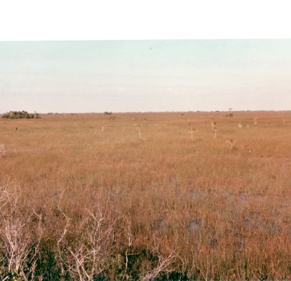 The next photo is of a marsh called “Marl Prairie.” These large areas of freshwater marl prairie border the deeper slough of the Everglades. The marl allows slow seepage of the water but not rapid drainage. The sawgrass is not as tall and the water is not as deep, freshwater marl prairies look a lot like freshwater sloughs.