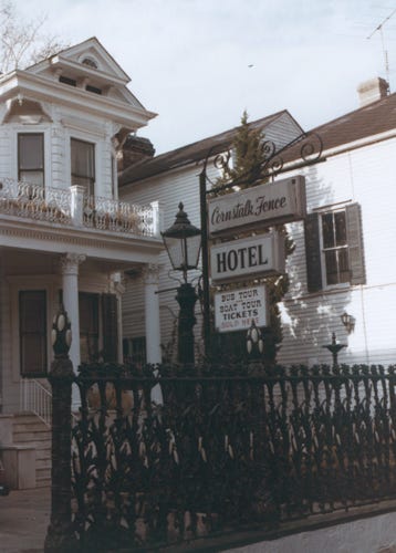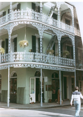 Another view of the French Quarters and a Cornstalk Fence, which is a painted row of iron cornstalks in front of 915 Royal Street.