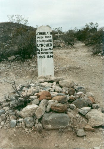 Now, it is time to head to Arizona where we stopped to explore the O.K. Corral scene of the Earp and Clanton feud fight in Tombstone. A view of Boothill graveyard and the graves of the Clanton’s and McLaury’s. You will see a gravestone marker that reads: John Heath taken from County Jail and lynched by Bisbee mob in Tombstone on February 22, 1884.