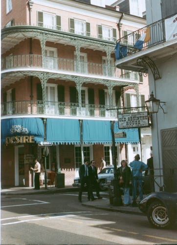 Walking downtown we came across this beautiful three-story building with the lace balconies at Royal and St. Peter’s Street in the French Quarters. At Bourbon Street and Bienville Street is the “Old Absinthe House,” and now the “Desire Oyster Bar,” in the Royal Sonesta Hotel.