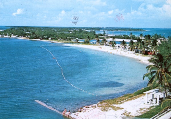 This is a postcard explaining and showing the old southernmost house and the new southernmost house on the southernmost point of land in the continental United States. This is also the South end of Duval Street, the “Longest Street in the United States,” going from the Atlantic Ocean to the Gulf of Mexico. South Beach, which is also the southernmost beach, and South Beach Motel Row are in the background.