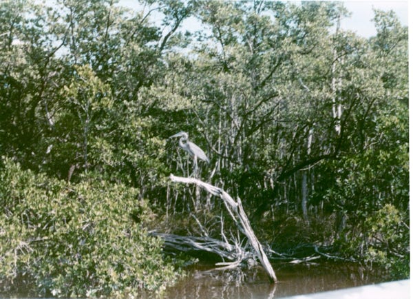 We got a canoe and paddled along the shoreline of the park and saw many brown pelicans on a sandbar. As you can see sitting on the tree limb another Blue Heron, and a large Osprey.