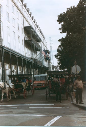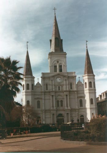 A view of the Cathedral at Jackson Square. There are many horse-drawn carts along the French Quarters.