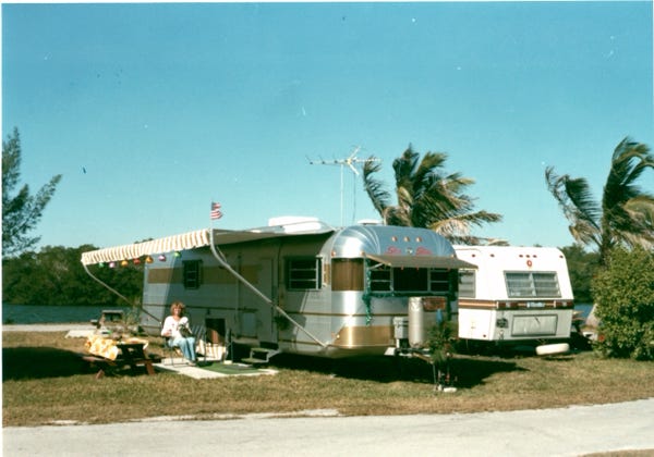 Nancy and I on Christmas Eve at the park, everyone put a candle in a paper bag in front of the rigs to light the path as people walk the area during the night. Our Christmas photo is in front of our trailer at Fort Meyers.