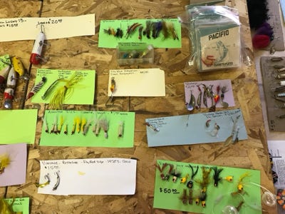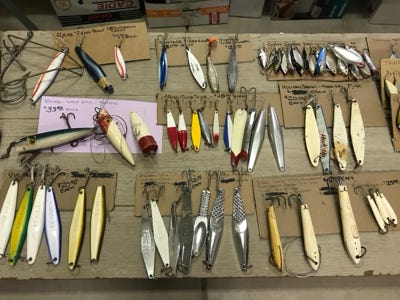 Albacore Holiday Special lures, Salas jigs, Maverick Outlaw Chrome jigs, Rare handmade bone jigs for tuna - made in Japan by Compac, Roddy Built Jigs, Dandy Tuna and Bonita Jigs, Vintage wooden plugs, and over 25 assorted sizes of feather jigs, along with hooks and leader material.
