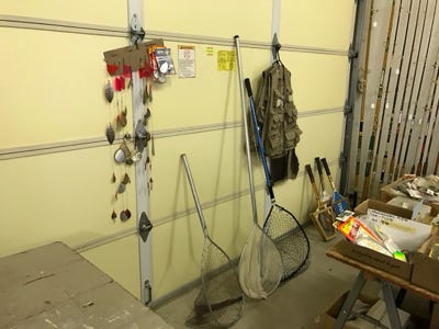 We have two fly vests, one size is small and one size is medium. We have two Danielson Fishing Creels and two hand-fly fishing nets. One of the nets is a Vintage 1950s Collapsible hand net, and the other is a hand net made in aluminum. We have three other nets, one is a long-handle bait net, one is a small aluminum net used for small fish, and the other one is a larger net with a collapsible handle that we use for salmon fishing.