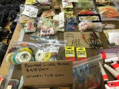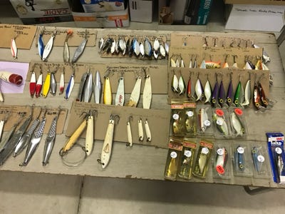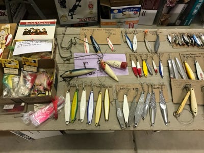 We have hundreds of lures from bass, crappie, walleye, trout, corvina, tuna, marlin, salmon, cod, halibut, redfish, and many more. To name a few of the lures that we have are Bomber wooden lures with a screw and Luxon line tie, Bomber plastic lures, Bomber plastic Waterdog lures, and Buckeye Bait Company Mad Minno to name a few. While we have counted all of the lures you see in the photos, we have tried to be accurate in the number of lures that we have.