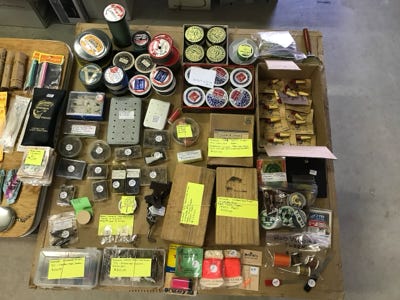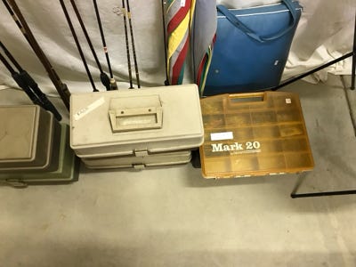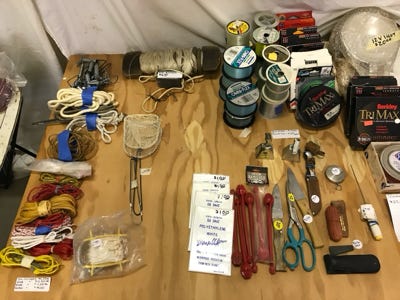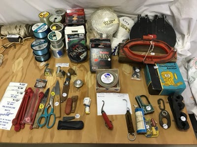 We have fifteen fish stringers of various lengths, a small anchor with a weight, several small minnow nets, plastic aprons, seven red hook removers, several knives and scissors, several stones to sharpen hooks, a compass, a worm threader, several bells for tying on the end of a rod when bait fishing from the shore. Many reels and boxes of line, and two boxes of leaded line. Two rubber rod holders to mount on a wall to store fishing poles, a rattlesnake kit, and some metal clamps.