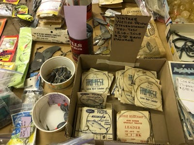 Bags of leader material, Vintage Erwin Weller Leader in original package (18 to 20 pounds), Allcock Hooks with Leaders - Made in England in original package, Cod rigs in original package, packages of steel leaders, many boxes and bags of assorted hooks, Mustad hooks, Eagle Claw hooks, stainless steel hooks, treble hooks, tube and flathead jig heads, large single hooks with leader material in various sizes, ball bearing snap swivels, quick clip snap swivels, barrel swivels, split rings, cigar snap swivels, nylon coated wire leaders.