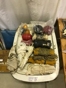 We have six Sea Anchors, medium to large size, we used these for trolling for trout when we wanted to slow down the speed of our boat. Also, you will see two rubber roller guides for a boat trailer, several boat tail lights for a trailer, rope, and a float. We have one blue square-seat float cushion for a boat. In the third photo, you will see a round black metal trolling plate, we used this to slow down our boats, one with the 70 hp Mercury motor, and also used it on our 25 hp Johnson motor. We have included an aerator for a bait tank, and two wooden support blocks for supporting a 5-gallon gas tank in a boat. Also, we have two 12-volt large spotlights that we use in our boats for night fishing.