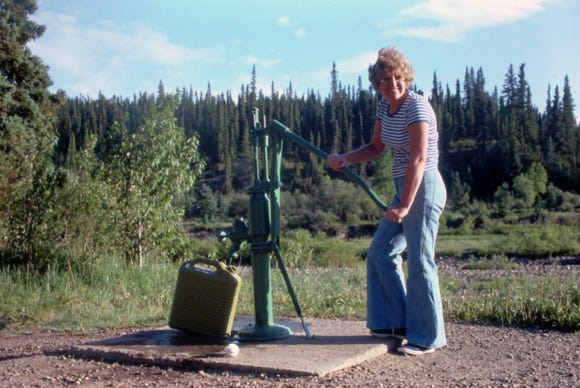 We arrived at Buckinghorse River Wayside Provincial Park, a scenic campground for those traveling to Alaska. You can see moose around the area and fish for Arctic grayling. The next morning Nancy is using a hand pump to get water into a 5-gallon container to transfer it to the RV. Along the route at various campgrounds, this was the only way to get water.
