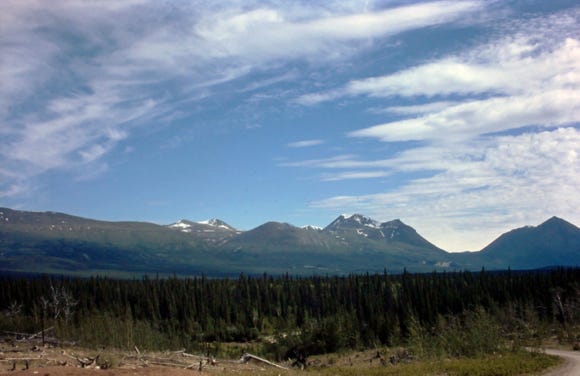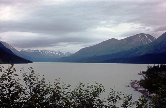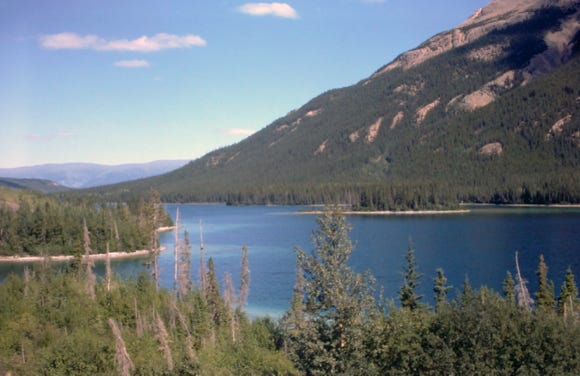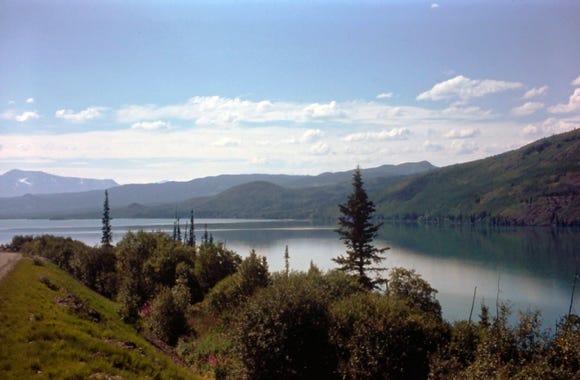 A view of the Kluane mountain range, where we camped at Jarvis Creek for the night, we fished and caught two whitefish and a grayling. We left the next morning and took a side road to Kloo Lake (an Indian word for fish), we fished from shore with a red and white wobbler and caught five pike in less than an hour, each weighing about two pounds. After cleaning the fish we then drove to Klaune Lake and Horseshoe campground. A photo of the mountain range in the Klaune National Park and more dirt roads at MP 1202.