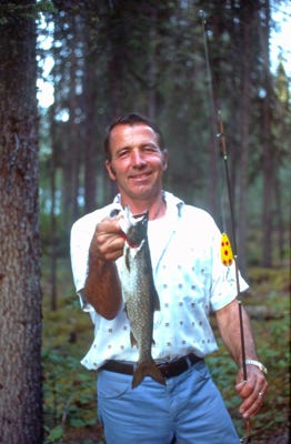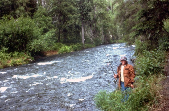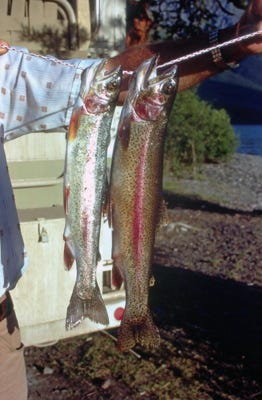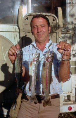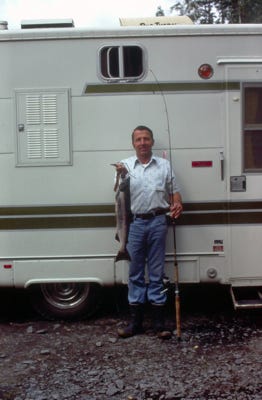 Arriving at Steward, we found a great restaurant to eat at and then drove around town and spent the night. The next morning we drove to the Russian River and found that all of the 100 campsites were full. We camped in the parking lot, and we hiked down to the Russian River where Bill caught a 6-pound salmon with a red and white wobbler.