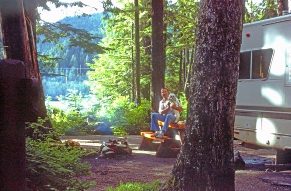 A photo of Bill and Lady at Exchamsiks River Provincial Park with the Sitka spruce rainforest that towers over the park on the Yellowhead Highway at MP 137.