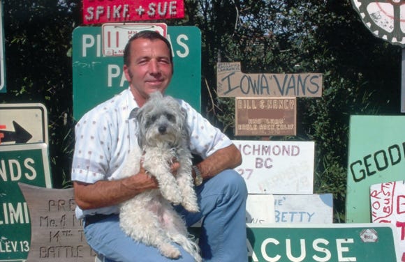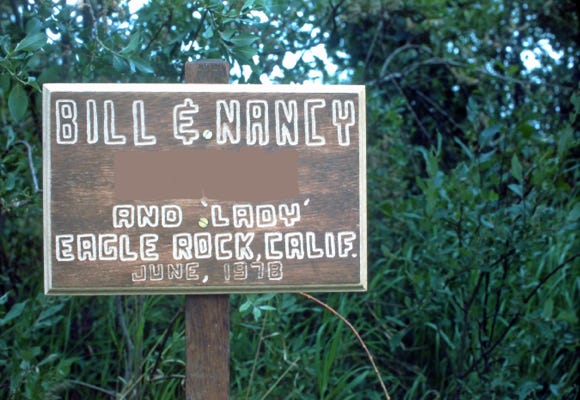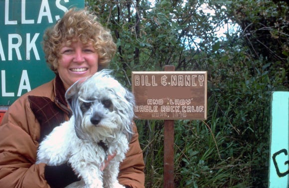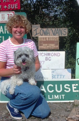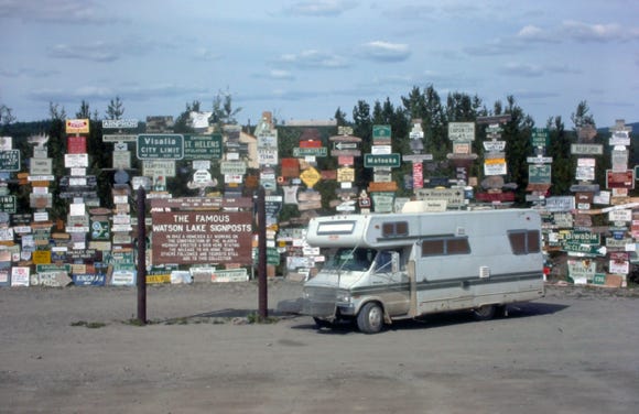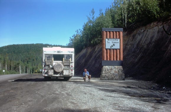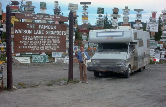 Before leaving on our trip to Alaska, we knew about the signpost area and made our special sign and mounted it along with many other signs. Bill is standing next to the Watson Lake signpost with our sign in his hand and with Lady in his arm. Nancy and Lady by their sign, you can see we picked a spot that was in an open area, but who knows where it is at today. There are over 80,000 signs and it continues to grow.