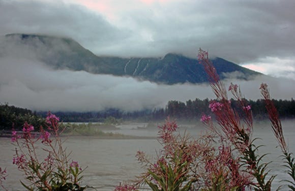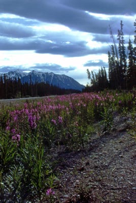 Leaving Whitehorse is a view of the mountains by Kusawa Lake at MP 958. At Champagne which is about 56 miles west of Whitehorse is an Indian village and a trading post. Driving along another long dirt road as we continue to Haines Junction in Yukon with a photo of fireweed along the side of the road.