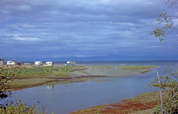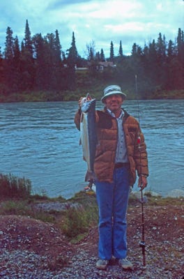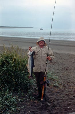 We stayed at a campground in Soldotna and Bill was fishing on the Kenai River by Spruce Street Road and used a jig and caught this nice 8-pound sockeye salmon and we lost three other fish that day. The next day Bill caught an 8-pound and 10-pound salmon that we traded in for canned salmon since our freezer was full of salmon and clams.