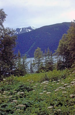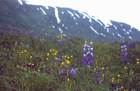 A view of Kenai Lake at MP 104 and rare pink albino lupines.