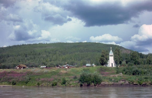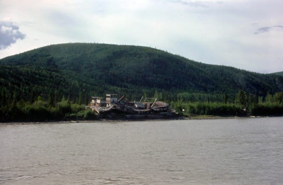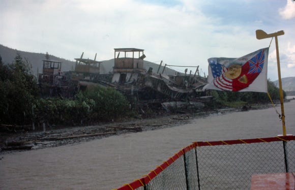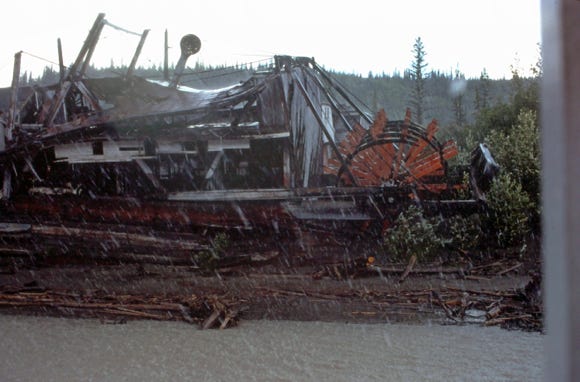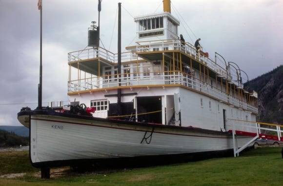 We took a boat trip on the river and got off to see the Indian village of “Moosehide,” and a photo of drying salmon and other fish. A church along the shoreline and a fishing wheel on the river. A photo of the paddle-wheeler graveyard and the SS Keno. The SS Keno was constructed in 1922 in Whitehorse and was the last paddle-wheeler to sail the Yukon River in 1960.