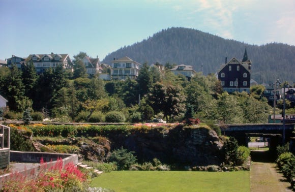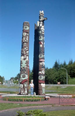 We arrived at Terrace and had to do some motor work on the Lazy Daze. During our trip, it was backfiring at times, either because of water in the gas or the carburetor. We arrived at Prince Rupert on August 8th at Port Edward and took more photos of totems in the area and the surrounding homes.