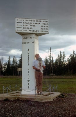 Arriving at the sign of the Northern Terminus of the “Alcan” Military Highway to Alaska, and Bill, and Lady in Delta Jct at MP 1422 “The End of the Alaska Highway.” The road to Tok and arriving at sunset on Moon Lake MP 1332.