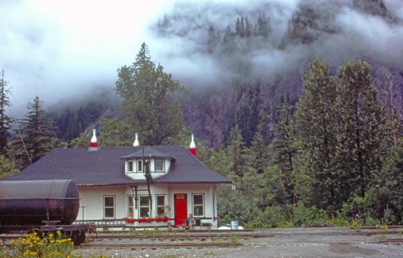 We are camping along the Skeena River, and the next day drive past waterfalls along the highway. The Kwinitsa Railroad station is on the Canadian National Railway mainline in Kwinitsa, British Columbia on the north side of the Skeena River across from the Yellowhead Highway 1.
