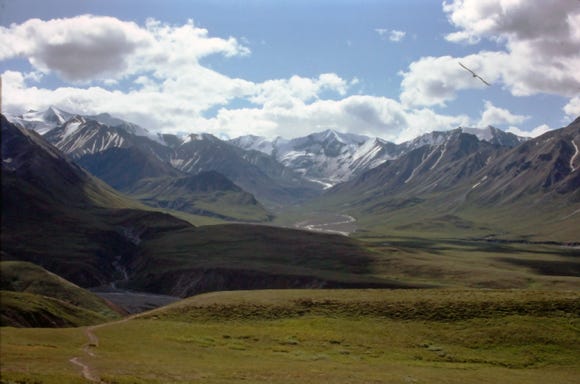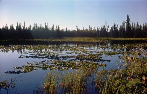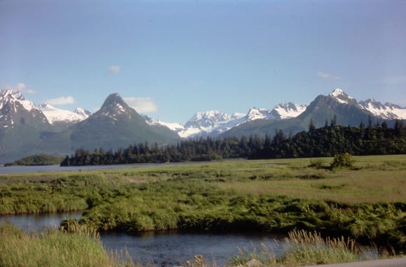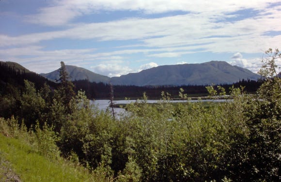 The scenery is very spectacular with meadows, marshes, cotton puffs in the wind, pink plumes of wheat grass, lily pads, and fireweed. In this photo, you can see the Alaskan pipeline that parallels the highway to Valdez. Photos of Willow Lake and the Wrangle Mountains at MP 88.