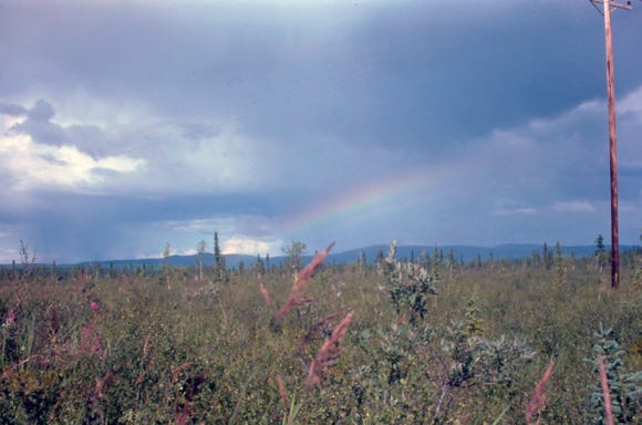 A photo of Nancy with Lady standing in front of the Malemute Saloon, located at Ester Gold Camp in the town of Ester at MP 151. More fireweed and a beautiful rainbow on a cloudy stormy day.