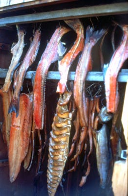We arrived on the Kenai Peninsula and fished for salmon off of the surf casing large treble hooks into the surf and reeling them into to shore. We each caught a sockeye salmon and you can see the red meat as we fileted the fish.