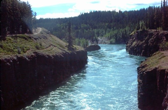 Leaving Watson Lake we continue to drive along another long area of dirt roads, and you can see by the back of the RV it is covered in mud. We stopped at the Yukon River, and Bill caught a nice grayling. This photo is of Miles Canyon, the headwaters of the Yukon River before we get to Whitehorse at MP 911.