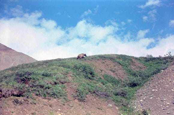 We did not get to see Mt. Denali because of the low clouds, so the next morning we went on the bus tour again and we got some great photos of Mt. Denali and the area. We took a photo of a grizzly bear walking up the side of a mountain, and other wildlife as we toured the area again.
