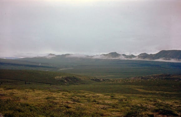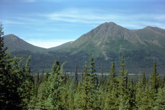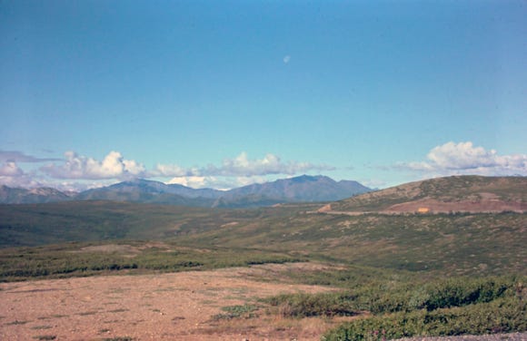 The next morning we are driving on Highway 3 (Taylor Highway) to “The Top Of The World,” also known as the “Skyline Drive.” This was a dirt road at the time of our trip to Dawson City. From Tok to Dawson City to Watson Lake were 1,200 miles of dirt roads.