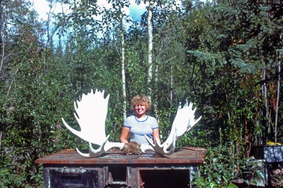 Arriving in Tok, it was time to re-group getting the RV washed now that we are finally on paved roads. Then a lube job, oil change, getting propane, and a stop at the “Bucky Moose,” where Nancy and Lady are sitting. Leaving at 6:30 PM, we arrived at Dry Creek at 9:00 PM and spent the night.