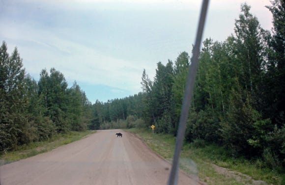 As you can see by the photos, we encountered road construction with a little more than lane-wide and muddy conditions along the route to Fort Nelson at MP 243. We took a photo of a bear crossing the road and a moose on a stormy day in a lush field.