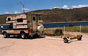 We first started using small double wheels on a square shaft that mounted on the rear transom of the boat, and a front tow bar mounted on the bow of the boat. We bought these items when we first bought our boat and loader. These items came from Edie, and we used them for several years to tow our boat from the campground to the launching ramp. This worked out all right for a short tow, but we could not legally tow our boat on the highway. We came across a portable, collapsible boat trailer made by, "By George" in California, this was street-legal with tail lights and larger wheels. We bought this for $350.00, but now comes the task of how to carry all the pieces with us.