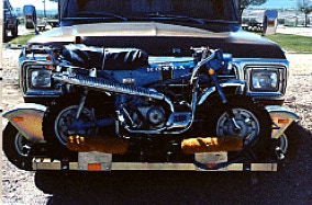After analyzing our choices, we decided to use our motorcycle rack for some of the pieces, as you can see above. The two boat wheels are mounted on each side of the motorcycle rack with brackets and bolts to hold them in place. In front of the motorcycle is the transom support of the boat trailer and back underneath this area sitting on the rack is the bow winch. On top of the camper roof, each side rail of the boat loader rack is where we put the long 2" x 2" square center rails. When we unload our portable boat trailer, it takes only 8 bolts to put it together and in 30 minutes we have a street-legal boat trailer. We have since sold our smaller wheels and front tow bar and now use our portable boat trailer all of the time. We have towed our boat on the highway for 50 miles without a problem. One thing that this does not have is springs, so we do have to be careful and try not to hit any potholes, and we usually tow at a speed of 50 miles per hour. We have seen people use a conventional boat trailer that they have cut into pieces and then assembled the trailer as we do, but the weight of a conventional trailer would be too much for us to try to handle and to try to get all the pieces up on the camper roof and on the motorcycle rack. As it is, when we are fully loaded with our camper, boat, motorcycle, 34-foot trailer, and two mountain bikes we are 22,500 pounds!