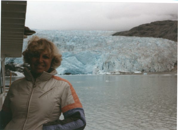 A photo of McBride Glacier and Nancy on the boat.