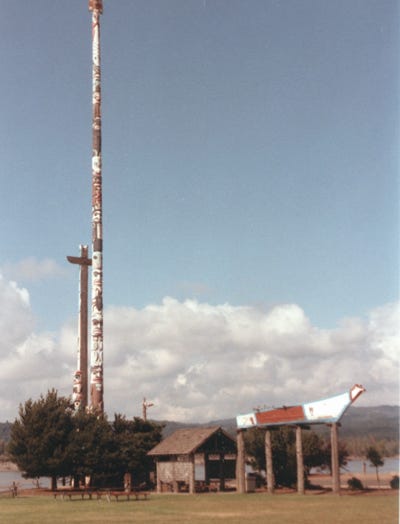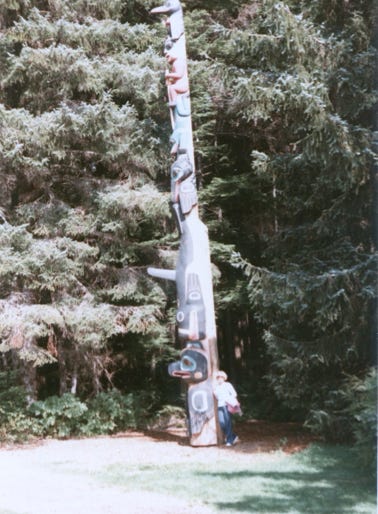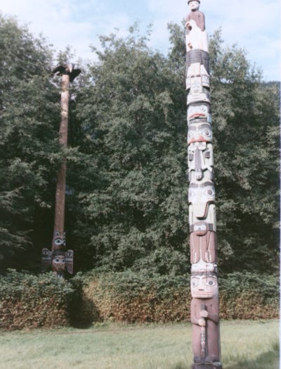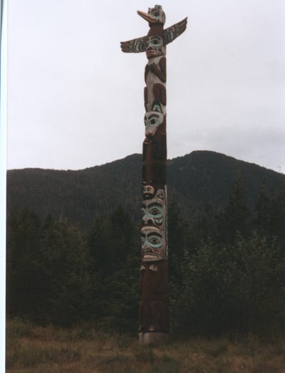 A large totem pole on Stakes Island.