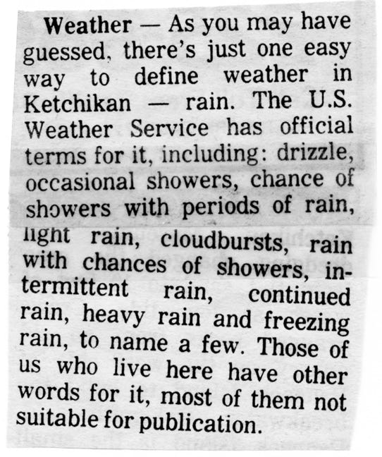 Ketchikan, it only rains twice in Ketchikan, January through June, and July through December. If you are planning an outing and it’s raining, do it anyway, if you don’t, you may never get the chance if you wait for good weather!