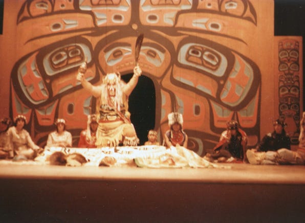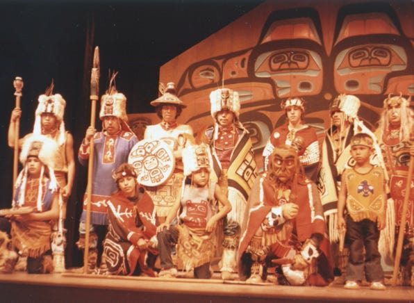 Another dance called “Ptarmigan Dance,” is performed by the group. They use many priceless artifacts, including several Chilkat blankets in all of their performances. A photo of the “Haida Blanket Dance.”