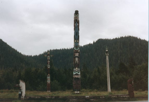 The park has a collection of totem poles of the Haida and Tsimshian Indians.