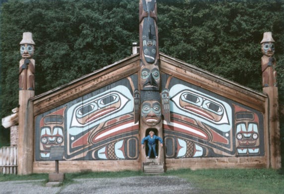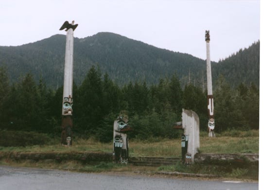 We walked the trail winding through the rain forest seeing many totems. On the shoreline from Totem Bight Park, with a photo and sunshine, yeah!