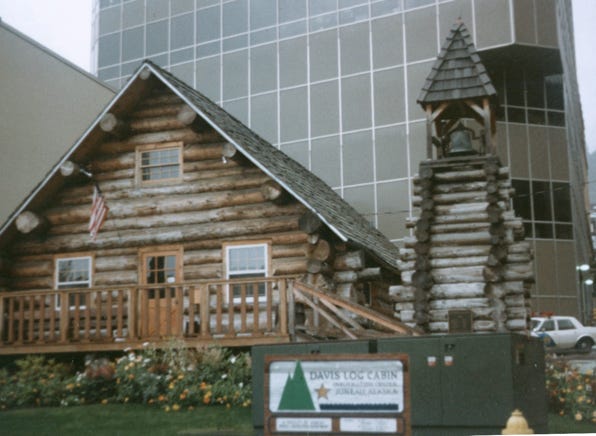 This is Davis Log Cabin, completed during Juneau’s Centennial year of 1980, it is a replica of the first church in Juneau, built in 1881. Used also as a dwelling, a carpentry shop, a school, and a brewery office before it was torn down in 1914. Now, it is a visitor’s center.