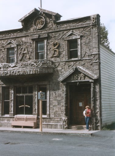 Downtown Skagway and a photo of the “Red Onion Saloon,” established in 1898. A photo of the 1899 “Arctic Brotherhood Hall,” is constructed of more than 20,000 small pieces of driftwood, very unique.
