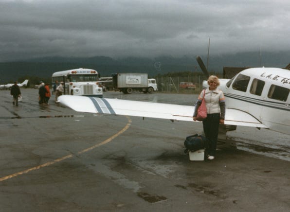 In an hour, we all got to the small single-engine plane and we took off for Glacier Bay. We had a young female pilot, and Nancy sat in the front seat next to her. She hates to fly, and so the pilot thought that she would be more comfortable in the front seat while Bill was taking photos of our flight. You hear so many stories about the small bush planes and crashes because of the bad weather. She took off, and away we went, she was a very good pilot and we landed safely at the airport at Glacier Bay.